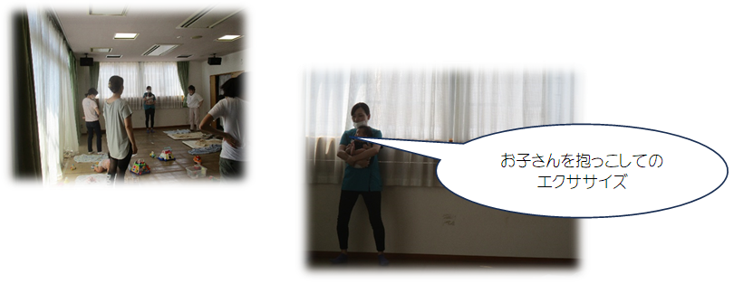 簡単な自己紹介を行ってから、上半身のストレッチからスタート☆お子さん達はママの近くで遊んだり、ときどきママにくっついてエクササイズの負荷になってくれたりしていましたよ!まだ歩けないお子さんを抱っこする機会が多い事かと思います。こういった機会に身体をほぐしてリフレッシュされてくださいね。