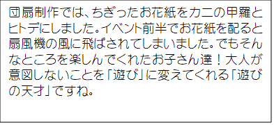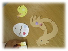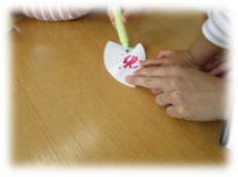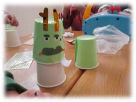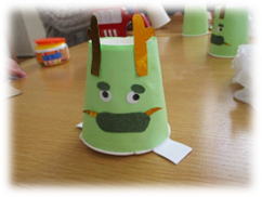 簡単おもちゃは、辰年にちなんだ「ジャンピングタッちゃん」という紙コップのおもちゃです。飛ばすのには大人の助けが必要かな?というおもちゃなのですが、くり返しあそぶ内にコツをつかんだお友だちもいましたよ。