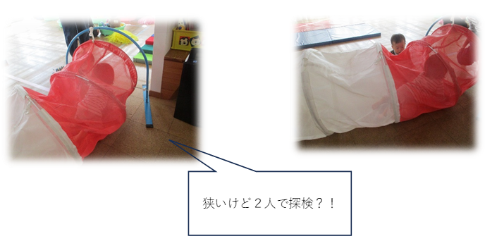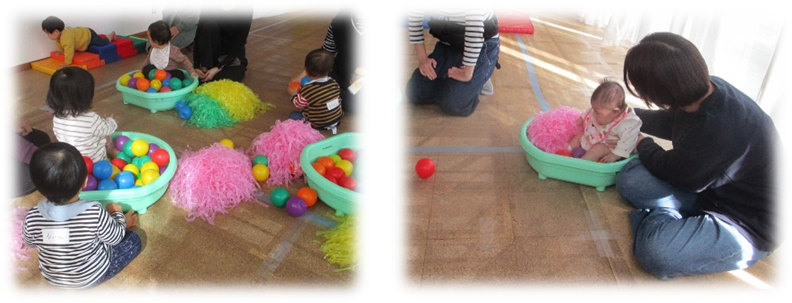 絵の具を乾かす時間に、ホールでボールプールやトンネル遊びを行ないました。まだ1人でお座りが出来ないお子さんもママに支えてもらいご機嫌な様子でした。