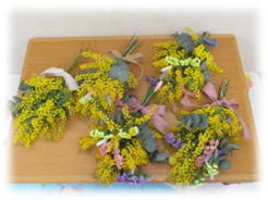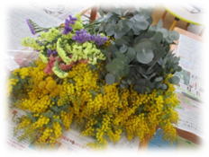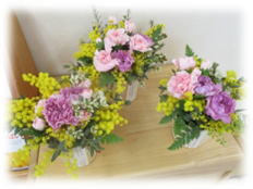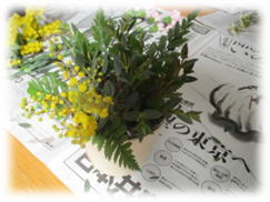 満開のミモザを使ったスワッグ作りを行ないました。スターチスやユーカリなどの素材を「どこに入れようかな」と悩みながらあっという間の1時間・・・小さいお子さんはおもちゃで遊んでいましたが、もうすぐ幼稚園に通い始める3歳のお子さんはママと一緒にスワッグ作りに挑戦していましたよ。素敵なリボンを結んで春いっぱいの作品となりました。