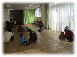 本日のみつばちひろばは、豆まきです。1歳になったばかりの子から2歳後半の子が参加してくれました♪