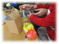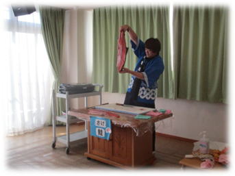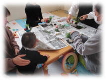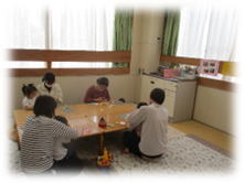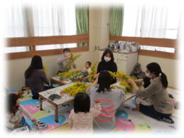 前半はひろばのお部屋でオーガンジーの布あそびと制作を行ないました。制作は「恵方巻き」おもちゃと豆を入れる箱「三方」です。制作では、黒い折り紙をちぎって糊で貼りました。