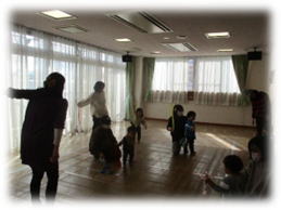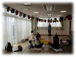 本日のみつばちひろばには、1・2歳のお友だちが遊びに来てくれました。講師の先生をお招きして行なう「リズム遊び」では、音楽に合わせ親子で身体を動かしたり、ピアノ演奏や紙芝居の読み聞かせの時間を楽しみました。ママと一緒に和太鼓を叩いたり、先生お手製のリボンを回したりと、盛りだくさんな時間となりました。ご参加ありがとうございました!