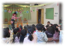 最初は「なにが始まるのかな・・・」と困惑(?)気味な子ども達でしたが、風船やボール、お皿回しのパフォーマンスに引き込まれ、声を上げて楽しんでいました。後ろの方に座っていた年長児は立ち上がって大喜びででした!
