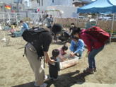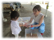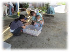 1歳過ぎのお子さん達は自分で動いて興味のあるものにトライ!お友だちがやっていることを観察したり、盥からボールを出す事に夢中になったりしていました。