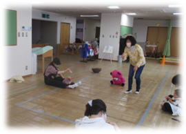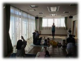 まずは、大きなピンク色のくまさん「いのっち」とご挨拶♪音楽に合わせて身体を動かす内に気持ちがほぐれていったかな?マラカスや和太鼓タンブリンなどの楽器あそびでは、「もっとやりたい」という様子のお友だちでした♡特に講師お手製の「リボン」を使う場面は、とっても楽しそうでした。ご参加ありがとうございました!