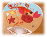 「手形アート制作」では、自分で用紙やスタンプの色を選び、シールやクラフトパンチで切り抜いた素材に糊を付けて、好きなところに貼ることが出来ました。