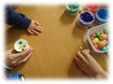 温めた透明や白色のの材料に粒状のカラフルな素材を選んで入れたり、食品由来の色素で色付けします。1・2歳のお子さんは素材に興味を示し容器に入れていました♡冷やしている15分くらいの時間には、親子で触れあい遊びを行いました。