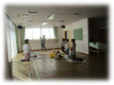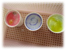 夏の活動で毎年行なう「色水あそび」・・・例年、外で行なっていましたが、高温のため急遽室内での活動にしました。