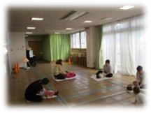 1歳のお子さんとご一緒に参加のママ達・・・お子さん達に見守られ(?)ながら、上半身をほぐすところからスタート♪身体をじっくり伸ばしたり動かしたり、お一人ずつの身体に合わせて講師がアドバイスをしてくださいました。お子さん達はママの近くで遊んで過ごしましたよ。今回はおもちゃの他にトンネルとすべり台もご用意しました。「シュー」とつぶやきながらたくさんすべって楽しんでくれたかな?ご参加ありがとうございました!