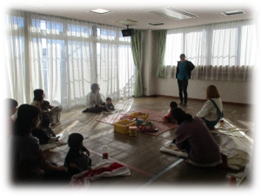 始めにピンクのクマさんとご挨拶を行い、ママの抱っこでゆらゆら揺れたり、高いジャンプをして遊びました。ハンドタオルで「いないいないばあ」をしたり、マラカスやタンバリン等の道具が登場しました。お友達に渡すとママにもどうぞと配ってくれました♡ご参加ありがとうございました。