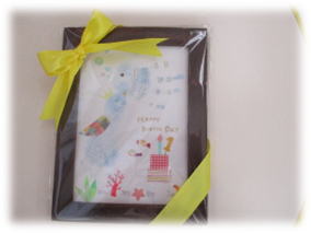 来園してすぐにおままごと遊びを楽しんでいたお友だち・・・手形用のスタンプを出すと、かわいい手を出してインクをつけ、ぺたり!ママが素敵な作品に仕上げてくださいましたよ。園長先生のインタビューでは自分の話とわかり、ちょっと恥ずかしそう?でも、椅子に座ってお話を聞く体勢をとったり、ママの側で遊びながら耳を傾けてくれていました。