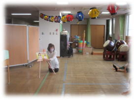 本日はみつばちひろばのなつまつり♪まずは、和室でお子さん達の名前を呼んでお返事してもらうことからスタートしました。手遊びや「お花紙」をちぎって遊んだあと大型絵本「おめんです」を読みました。お名前呼びでは、恥ずかしそうにしていたお友だちも少しずつ「場」に慣れてきてくれました。「お面」を付けてホールへ移動し、「ヨーヨー釣り」「ゲームコーナー」など楽しんでくれた様子☆保育園の園児が作った「お神輿」を担いだり、うちわの制作も行ないましたよ。今年は地域のお祭りに参加する子も多いかな?楽しい夏になるといいですね♡