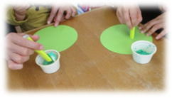 始めに紙にスタンプしてミモザのリース作りを行ないました。「なんだろう?」と興味を持つ子、「おもちゃで遊びたい」と言う気持ちの子、お子さんによって反応は様々です。お子さんのペースで制作の時間を楽しみました♡