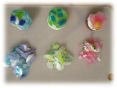 切手サイズに小さく切った「クレープ紙」という紙を水の中に入れると・・・ジワーッと色が溶け出します。本日遊びに来てくれたお友だちは、この遊びを少し行なうと、一旦休止。大好きなおままごとで遊び始めたのですが、しばらくすると再開☆ママとひろば担当がおしゃべりする横で、小さな容器を持ち「水を入れてください」とひろば担当に差し出し→桶に水を入れ→また「水を入れて下さい」→桶に水を入れ・・・とくり返し遊んでいました♡ご参加ありがとうございました!