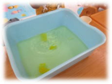 暑い日が続いていますね!本日のみつばちひろばは、お部屋で色水あそびを行ないました。
