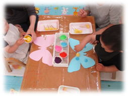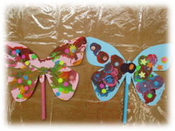 絵の具が乾いた後は、シールやクラフトパンチで切ったもので飾り付けをしました。最後に持ち手の棒を付けたら…ちょうちょになりました~♪