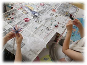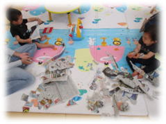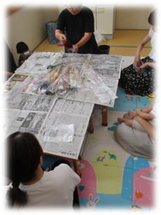 乾かしている間は新聞紙遊びをしました。ビリビリ破いてみたり、ぐしゃぐしゃ丸めてみたり、ボールを作ったり、食べ物を作ったり、とても楽しんでいました。