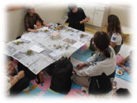 ミモザや木の枝、木の実を合わせて紐で束ねて木の板に貼り付け、素敵な壁飾りとなりました♪お子さんたちはママの傍で遊んだり、離れたところで絵本を読んだりおもちゃで遊んだり、楽しく過ごしていました♪