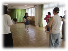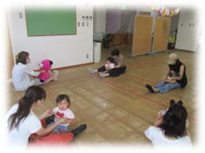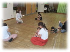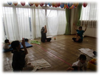 音楽に合わせて身体を動かすうちに、ニコニコ笑顔になってきます。鈴やタンブリン、シェイカーを使ったり、講師のピアノ演奏でママ達と歌ったり、元気いっぱいの活動となりました。大型絵本「だるまさんの」を読んでいる時は、みんな上手にだるまさんの真似をしていました♪