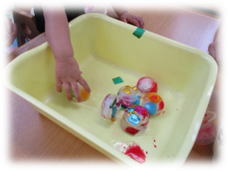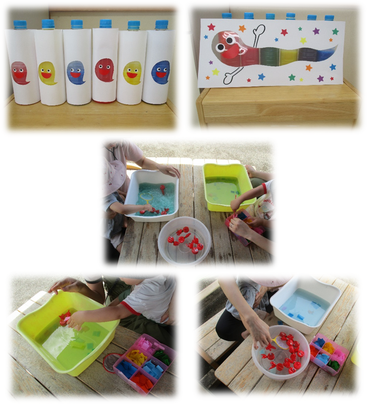 水の中にクレープ紙を入れて、水の中で色がにじみ出る様子を観察してみたり、いろんな色を混ぜてみました。きんぎょすくいも用意し、お友だちは夢中になって遊んでいました♪
