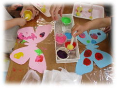 手持ち付きスポンジに絵の具を付けて上手にペタペタ…みんな夢中になってたくさんちょうちょに模様を付けていました♪