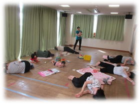 本日のみつばち広場は骨盤ケアでした。骨盤ケアでは理学療法士の先生に来ていただき、産後のママが身体をほぐすストレッチなどを行っています。
